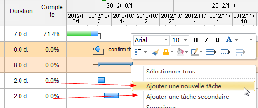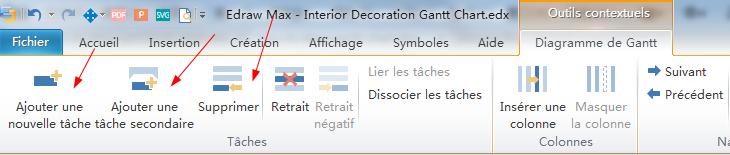 Vous pouvez également utiliser les boutons de raccourci dans la barre d'outils de diagramme de Gantt pour ajouter une tâche, une tâche secondaire, ou supprimer une tâche.