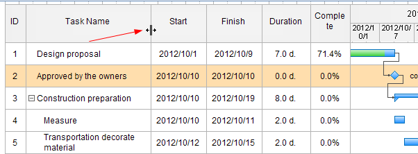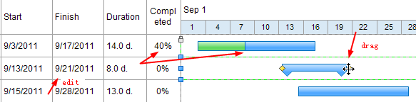 Sélectionnez une tâche, alors il y aura deux poignées jaunes; faites glisser les poignées pour modifier la longueur de la barre de progression. Puis la date de début, date de fin et la durée seront modifiés automatiquement.