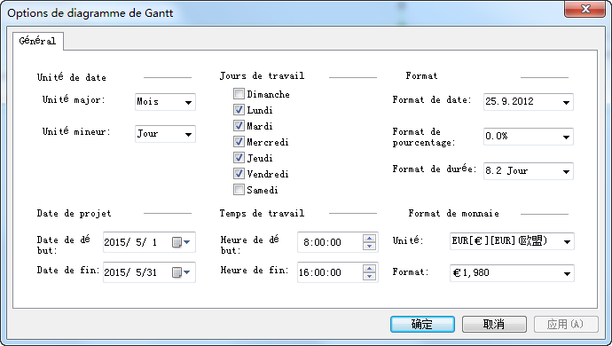 Etape 1. Démarrez un modèle de diagramme de Gantt de la catégorie de Gestion de projet. Sur la gauche de la toile, vous verrez une bibliothèque contenant un groupe de modèles de graphiques de Gantt. Faites glisser un modèle et déposer sur la toile, et le dialogue Options de diagramme de Gantt apparaîtra automatiquement. Vous pouvez régler l'unité de date, format de date, date de début et de fin dans le dialogue.
