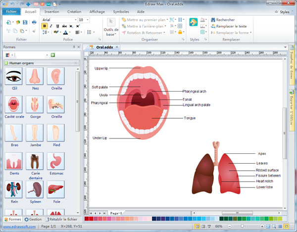 Comme le montre la photo ci-dessous, il a une interface d'utilisateur simple et très intuitive, presque le même que le programme Microsoft. Tant que vous pouvez utiliser le Microsoft Word, vous pouvez certainement utiliser ce logiciel. Tous les clip-arts vectoriels prédéfinis d'organes humaines montrent sur la gauche de la toile. Il suffit de glisser les symboles dont vous avez besoin et déposer sur la toile. Les symboles sont en format vectoriel, qui vous permet de redimensionner, faire pivoter et de recolorer.
