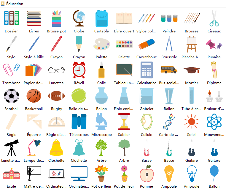 Vous avez accès à une bibliothèque de cliparts éducatifs comme des stylos, crayons, basket-ball, football, réveil, enseigner, tableau noir, élève, guitare, etc. Ils sont des graphiques vectoriels et peuvent être modifiés sur la couleur et la taille si nécessaire.
