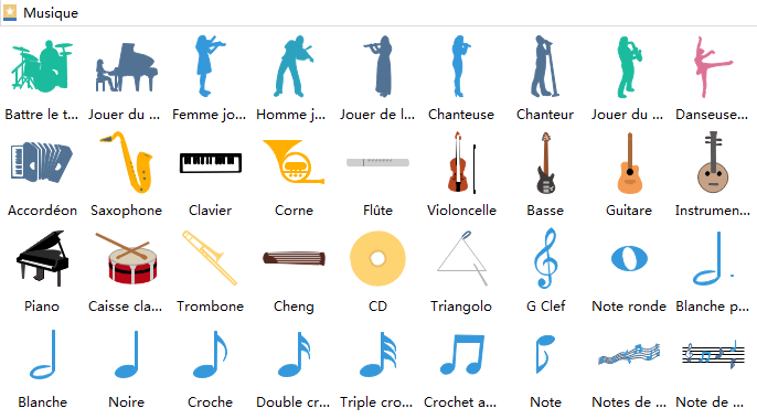 Le logiciel d'infographie Edraw contient presque tous les cliparts d'instruments et les symboles liés à la musique que vous pouvez utiliser pour concevoir une infographie de la musique. Tous ces cliparts et symboles peuvent être redimensionnés sans aucun dommage sur la clarté.