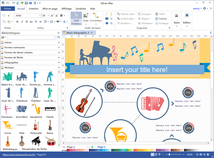 Le logiciel d'infographie Edraw est un logiciel de dessin infographique très apprécié. Il contient beaucoup de modèles d'infographie de musique, cliparts d'instrument, symboles et icônes nécessaires pour l'infographie de musique. Il pris en charge également l'alignement automatique, l'auto-distribution et l'auto-mise en page, ce qui peut vraiment faire votre tâche facilement. En outre, vous êtes autorisé à exporter votre conception à d'autres formats tels que PNG, JPEG, PDF, PS, EPS, Html, SVG, etc.