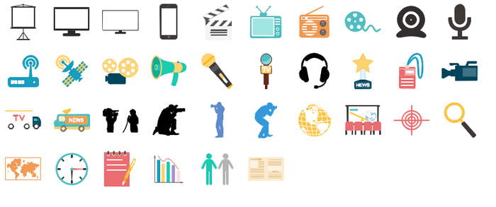 Le modèle ci-dessous présente plusieurs équipements courants utilisés dans le travail médiatique, comme les caméras, les récepteurs radio, etc.