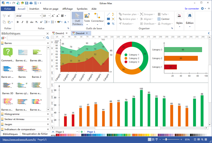 Pour créer un tableau de bord KPI, vous pouvez utiliser une grande variété de graphiques et de diagrammes, tels que le graphique circulaire, les histogrammes, les secteurs, les anneaux et des jauges. EdrawMax, un outil de diagramme tout-en-un, fournit un moyen rapide et efficace de créer d'excellents tableaux de bord KPI.