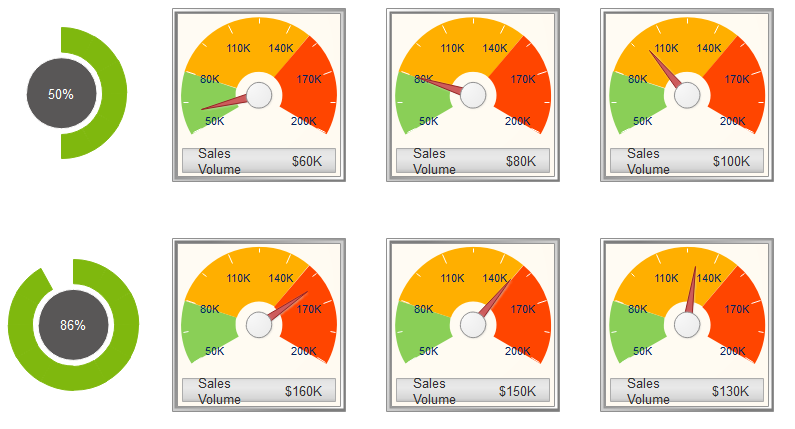 Ajouter des indicateurs de comparaison sur votre tableau de bord KPI pour afficher le statut. EdrawMax comprend une bibliothèque d'indicateurs de comparaison différents pour votre conception de tableau de bord KPI. Tous les indicateurs ont des comportements intelligents. Lorsque vous modifiez les données, la forme changera en conséquence, très pratique.