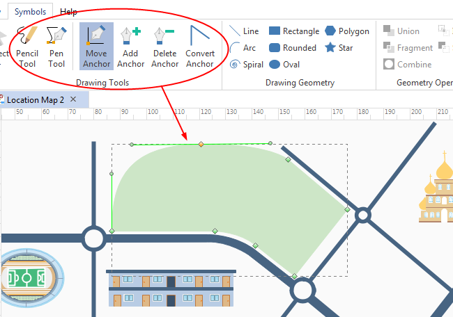 Le logiciel de cartes de localisation comprend des bibliothèques de symboles prédéfinis permettant de composer des cartes de localisation. Vous obtiendrez des symboles vectoriels pour les routes, les ponts, les régions, les points de repère et les panneaux routiers. Les symboles peuvent être étirés sans perte de qualité. Faites glisser et déposez les symboles nécessaires sur le canevas pour commencer rapidement votre conception.