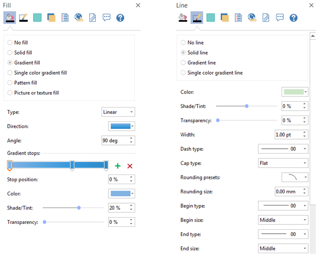 Ouvrez le volet Tâche de formatage à droite du canevas, puis vous pouvez y modifier le remplissage de la forme, la ligne et l'effet d'ombre.