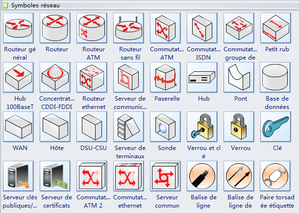 Le logiciel de réseau Edraw comprend de nombreux symboles de réseau, routeur générale, routeur, routeur ATM, routeur sans fil, commutateur ATM, commutation RNIS, commutateurs de groupe de travail, petite moyeux, moyeux de 100BaseT, CDDI-FDDI concentrateur, routeur Ethernet, WAN, hôte, DSU-CSU, etc.