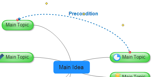 L'outil Insérer une relation permet d'illustrer une relation particulière entre deux sujets ou sous-thèmes de votre Mind Map à l'aide d'une ligne d'association qui apparaît sous la forme d'une ligne pointillée entre les sujets associés.