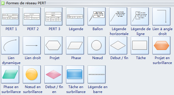 Les symboles de diagramme PERT Edraw incluent beaucoup de formes spéciales d'objets de diagramme PERT, telles que PERT 1, PERT 2, PERT 3, la légende, le ballon, le ballon horizontal, la légende horizontale, le connecteur dynamique, le projet, la phase, le noeud, le début / fin, la tâche, et la légende unique. Vous trouverez toutes ces formes d'une grande aide lors de l'élaboration des diagrammes PERT.