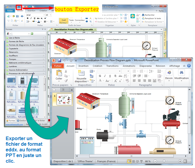 Essayez notre logiciel pour faire de votre schéma tuyauterie et instrumentation pour la présentation PowerPoint beaucoup plus vite que MS Office. Après le schéma tuyauterie et instrumentation est terminé, il peut être transformé au format PowerPoint en 1 clic.