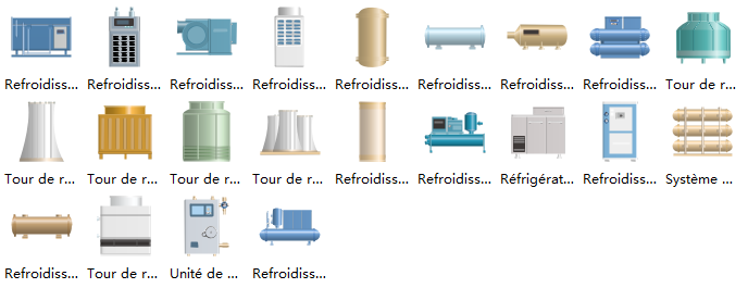 L'image suivante montre une capture d'écran de la bibliothèque de symboles de refroidissement de procédé dans Edraw. Il a une collection complète de formes vectorielles de refroidissement de procédé de P&ID. Vous trouverez le refroidisseur à absorption, le refroidisseur, le générateur de froid, le tour de refroidissement, le refroidisseur à moteur, le système de réfrigération au gaz naturel, le refroidissement simple, l'unité de contrôle de la température, etc.