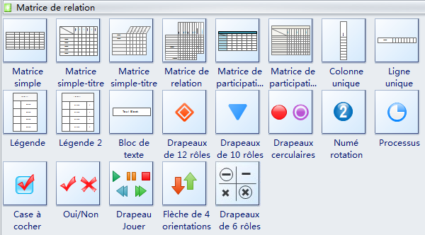 Les symboles de matrice de relation Edraw inclut de nombreuses formes spéciales utilisées dans la matrice relationnelles, la matrice simple, la matrice verticale avec titre simple, la matrice rectangulaire avec titre simple, la matrice de relation avec le poids, la matrice de la participation, la colonne unique, la rangée unique, la numérotation, etc.
