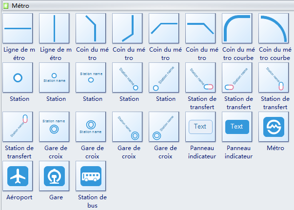 Les symboles de plan de métro Edraw vous fournir beaucoup de formes spéciales, telles que la ligne de métro, le métro coin, la courbe de métro, la gare, la station de transfert, la gare de croix, les étiquettes, l'avion, etc. Toutes ces formes particulières permettent de dessiner un plan de métro dont vous avez besoin.