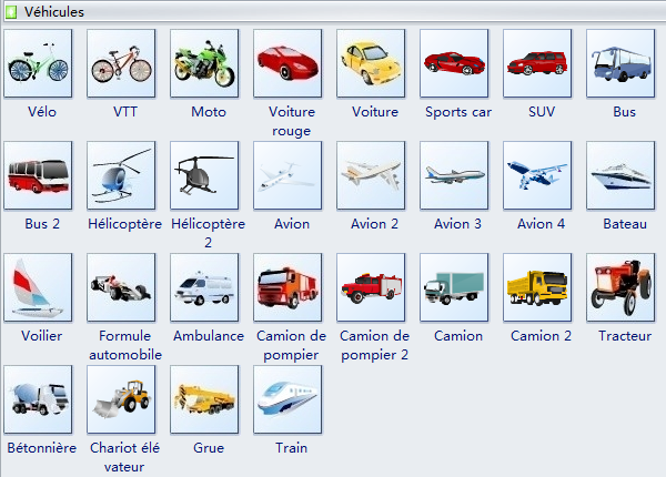 Edraw contient une grande variété de clip arts véhicule vectoriels disponibles pour votre conception, y compris les vélos, le VTT moto, la voiture, le bus, l'hélicoptère, le bateau, l'avion, etc., comme indiqué ci-dessous.