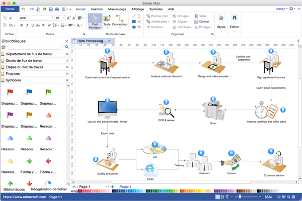 Edraw est un logiciel de création de diagrammes de workflow vectoriel contenant des caractéristiques similaires avec Visio. Avec lui, vous serez en mesure de concevoir même des diagrammes de workflow les plus sophistiqués avec un couple de traînée et de clics. Des fonctions automatiques vous aident à connecter les éléments du diagramme aussi nettement que possible. Le travail manuel minimum est nécessaire grâce aux formes intégrées et aux modèles pré-dessinés.