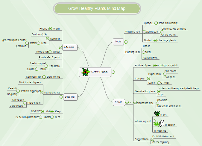 Growing plants may be easier than raising kids, but the two pursuits have their similarities. Building a good home environment for strong roots, weeding out bad company, giving extra protection at the toddler stage, providing support but more independence as they mature. This grow-healthy-plants steps mind map will make a plant expert.