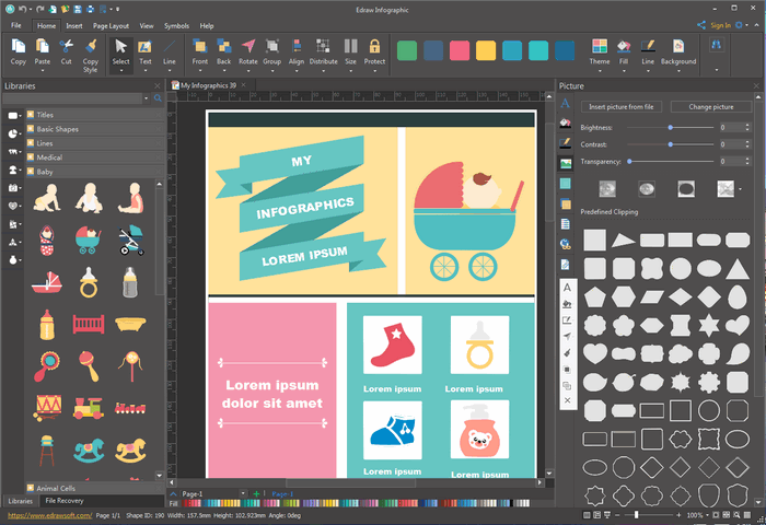 This software supports editing infographic contents including text, images, layout. It also allow you to insert your local pictures to the design. Once the infographic is completed, you can export it to pdf, html, jpg, png format, etc or print it according to your needs.