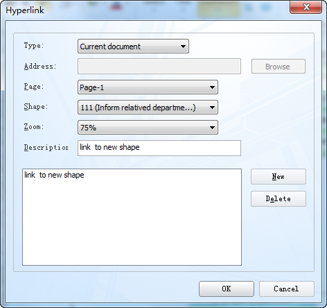 Trascinando la forma di riferimento fuori pagina nel riquadro di disegno, si apre una finestra di dialogo per l'impostazione dei collegamenti ipertestuali. È possibile scegliere la pagina, la forma o il documento a cui si desidera collegare il collegamento.