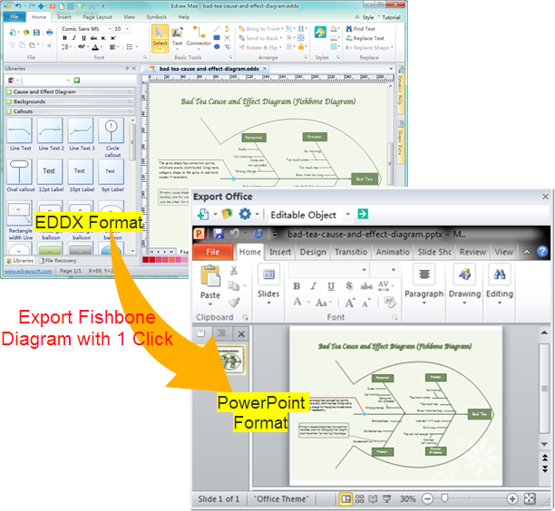 In Edraw, con un solo clic il diagramma a lisca di pesce diventa un file di PowerPoint completamente modificabile. È sufficiente fare clic sul pulsante Esporta nella barra degli strumenti di accesso rapido.