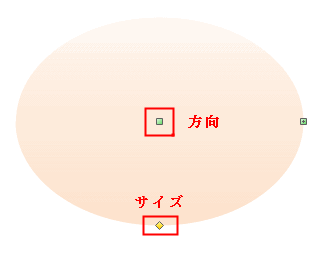 緑の方形のハンドルをドラッグしてから、長円の方向を変更でき、そして、黄色のひし形のハンドルで、サイズを調節することができます。