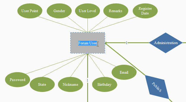 図形を右クリックして各オブジェクトの属性を設定します。すべてのERD 図形にいくつかの基本的なデータや属性が含まれます。図形の外観はその属性や図形に付けられている関連データにより決められます。図形を右クリックして、さらに「図形データの定義」をクリックして、ショートカットメニューにおける主要な属性をチェックしたり変更したりします。