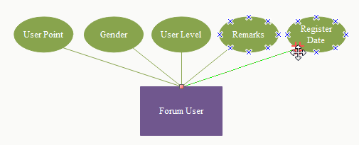- 内蔵のERD 図形にはコネクションポイントが設定されておくので、自動接続可能です。ERD 図形ライブラリからコネクターをドラッグして、図形を接続し始めます。コネクターのスタートポイントを一つの図形の上にドラッグして、そしてコネクターの矢印を他の図形におけるコネクションポイントの上にドラッグします。コネクターのエンドポイントが赤になると、図形が接続されているようになります。