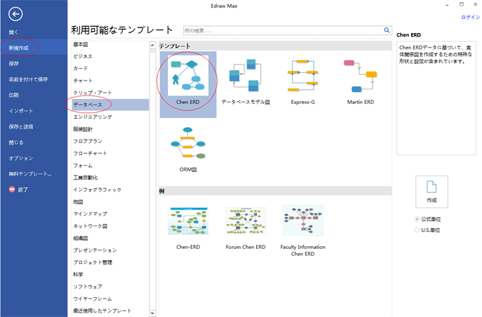 まずは「新規作成」ボタンをクリックします。「データベース」を選んで、Chen ERDやマーティン ERDなど作りたいER図をダブルクリックします。