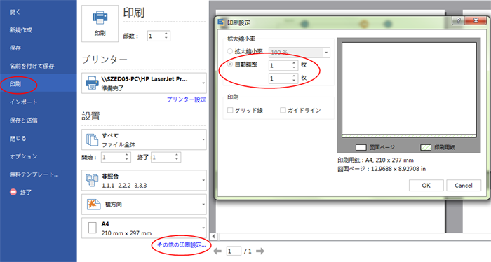 ダイアグラムのページが印刷紙より大きい場合は、ダイアグラムが1枚以上で印刷されてくるようになります。1枚だけでいいなら、「そのほかの印刷設定... 」をクリックして、「自動調整」を選択します。