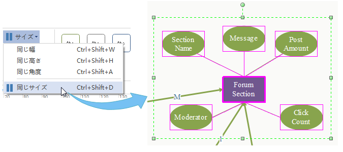 ホームメニューにおける同じサイズツールを通じて、いくつかの図形をすぐに同じサイズに設定できます。