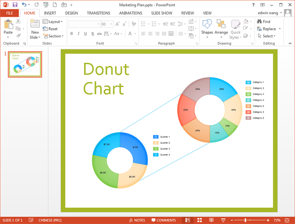 Edraw ライブラリにおけるすべてのテンプレートに色、テーマ、効果などが編集可能です。ドーナツグラフの例から、お気に入りのを一つ選択して、ワンクリックでPowerPoint に変換します。