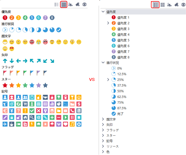 - マークパネルの表示には2つのビューがあります。1)リスト表示(テキストあり)。 2)タイル表示(テキストなし)