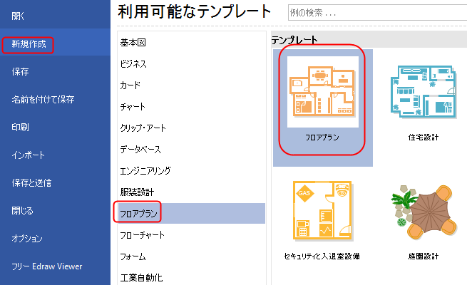 ファイル > 新規作成 > フロアプランの手順に、お気に入りの間取りテンプレートを選んで、さらにダブルクリックして、新たな図面ページを開きます。