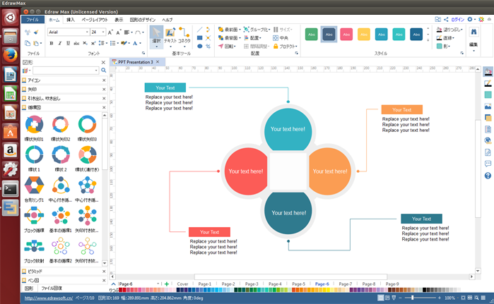Linuxで動作するプレゼンテーションプログラムは少ないですが、Edrawプレゼンテーションソフトはそのうちの良い選択肢です。プレゼン資料作成に役立つ様々なグラフやとチャートがあり、おしゃれで制作されたテンプレートも大量で無料で利用できます。ソフトウェアを起動し、ドラッグアンドドロップだけで、わずか数分で素敵なプレゼンテーションに仕上げるのは可能になります。
