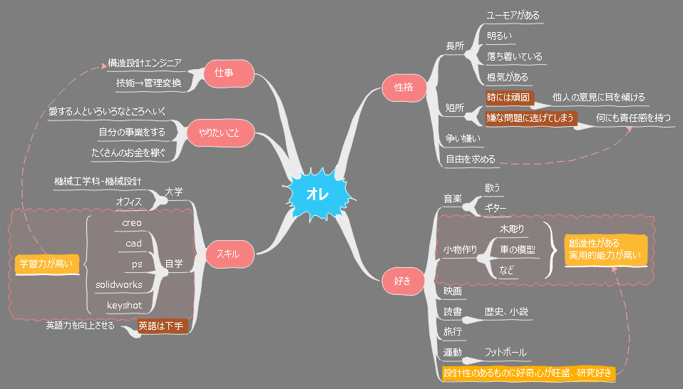 学生であろうと、社会人であろうと、自己分析はいつも注目されている課題です。マインドマップは自己分析を行うための効果の良いツールです。趣味、成長、短所、長所、友たち、家族、学業などいろいろな要素と説明をマインドマップのブランチに追加して、マインドマップ全体を使って自己分析を行います。これは自己認識、自己改善、自己PRに役立ち、就職活動に活用できます。
