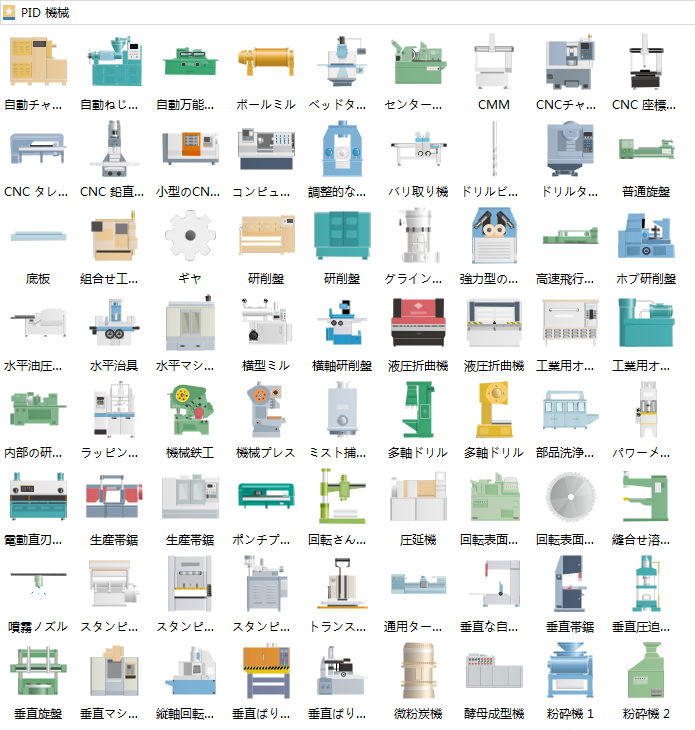 見えるように、下記の写真で、EdrawにおけるP&ID 機械記号を一覧できます。自動チャッカー、自動ねじ切り盤、ボールミル、CMM、研削盤、ドリルビット、ギヤ、粉砕機、圧延機、酵母成型機など機械に関してベクター形式の専用図形をご利用いただけます。