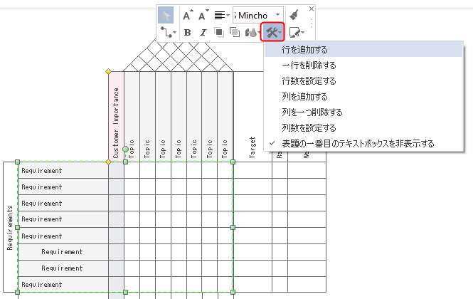 図形のショートメニューにより、品質機能展開表の行列、フォーマットなどをクイック編集できます。