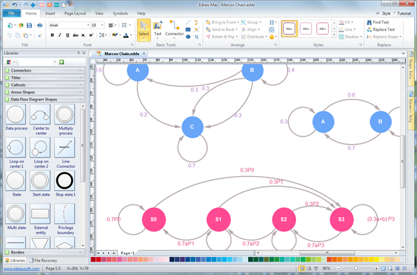 Still looking for a software for quickly drawing the Markov chain or category diagrams? Edraw is flexible enough to be used as a generic program for drawing just about any kind of diagram, and it includes special shapes for making Markov chains. For years of improvements and innovations, it has now streamlined for ease of use in generating Markov chains and other diagrams. The interface is very modern and gives an MS Office feel, which enables new users to start in minutes. You just need a few clicks of adding shapes, adding text blocks, applying colors and arraging the layouts to finish a Markov chain. When finish, you can export the file to PDF, PPT, Word and a lot more common file formats.