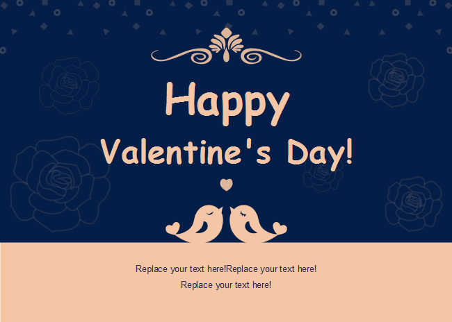 The color tone of this valentine's day card template is dark blue overlaid with roses. Two cute birds are in the middle of the card with wishes 'Happy Valentine's Day'. Start rapidly with this royal style valentine's day card template from Edraw template collection.