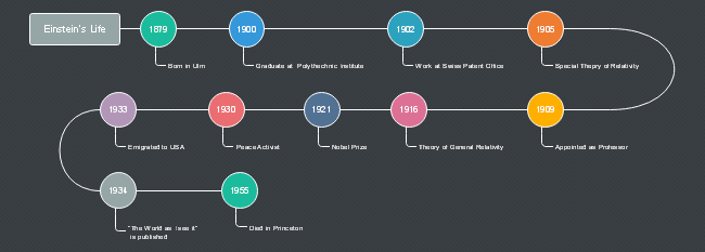 Learn about the great stories and milestones of Einstein by simply read this free Einstein life timeline template. Feel free to switch between different timeline theme choices and background colors in the free download version right away!