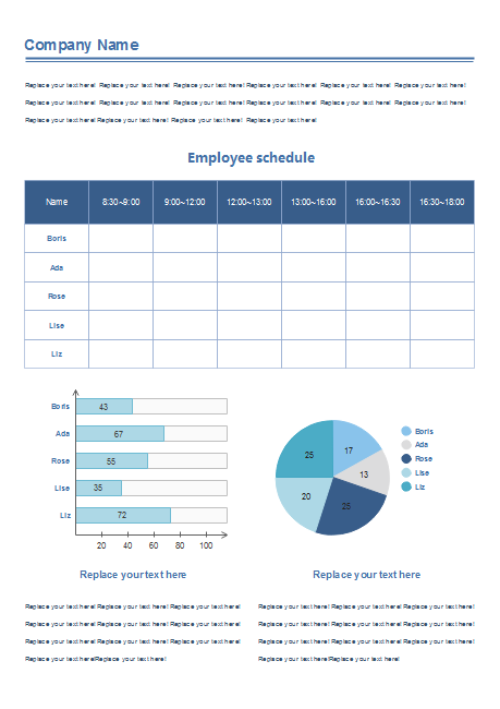 Use this employee schedule form to better organize employee's time and promote the efficiency of work. The schedule form can be edited according to your requirements. The table's columns and rows can be modified, and the charts go with your real data. Download for free.