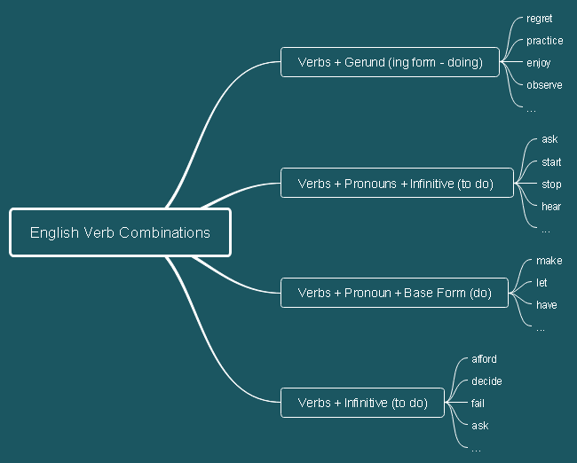 The English verb combinations mind map gives some examples of verb usages with gerund, infinitive and base form. Teachers may use it as an assignment so that students can add sentence examples directly. Edraw cloud collaboration offers convenient and easy sharing.