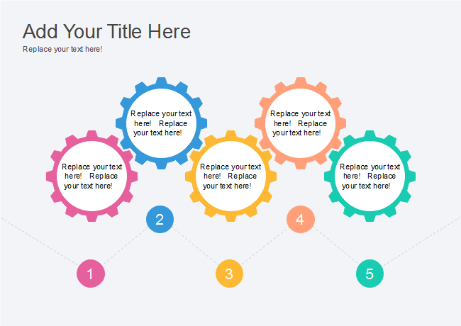 Five colorful gears have been designed for 2D presentation template to describe a list of brief idea phases. Grey background with bright color gear blocks makes this template best-illustrated business scenes. Download and customize with Edraw free.