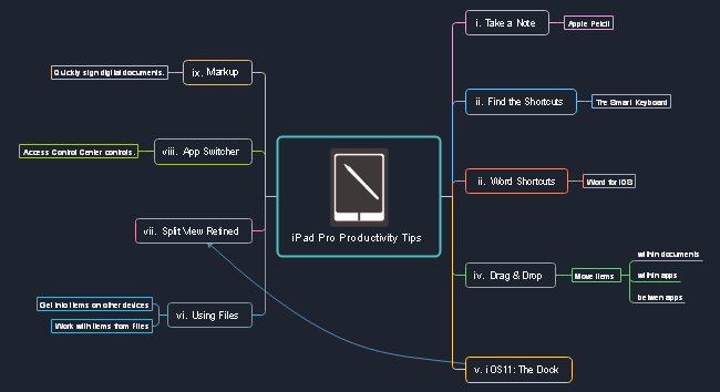 This is a mind map template listing the functionality of iPad pro that can improve productivity. Check the ideas quickly and try them out on your iPad Pro to implement the functions. Add more iPad Pro skills to make full use of your device and boost work efficiency.