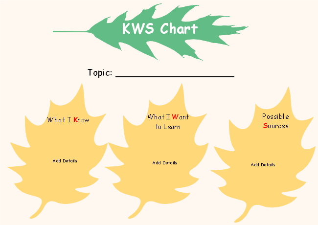 The KWS chart offers a convenient way for students to organizer key information by identifying what they know, what they want to know, and what they have learned. For example, this leaves kws chart template lets you easily fill in details during classes.