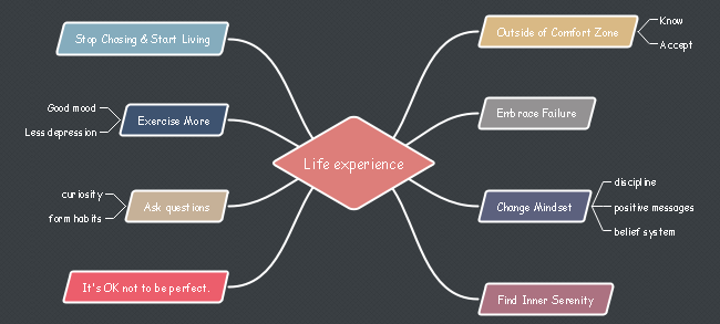 Want to explore life experience in a visualized way? Why not view Edraw life experience mind map template to learn from. Stop complaining and Start with organizing your life right now to plan your life with mind mapping approach.