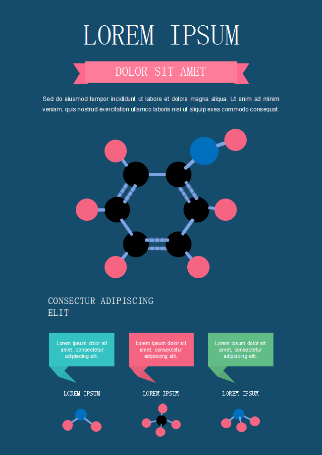 This is a molecular flyer shows the structure of a molecule and its constituents. Look through Edraw's symbols library for other molecules and chemistry illustrations. Replace the existing elements in this template with your favored decorations.