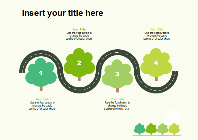 Road with four trees 2D presentation template is breezy for users. The color tone is forest green with a wandering road and four thick trees. This presentation template gives a deep impression with fresh style which could be used for any situation.
