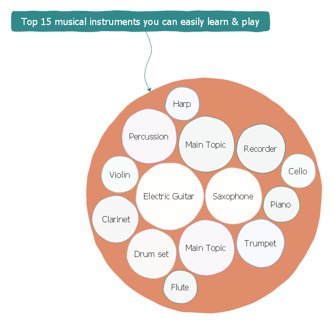 The top musical instruments circle map template here lists out the top 15 popular musical instruments that you may want to have a try in your spare time with your fellows. See more free built-in circle map templates and symbols in the free mind mapping software today.